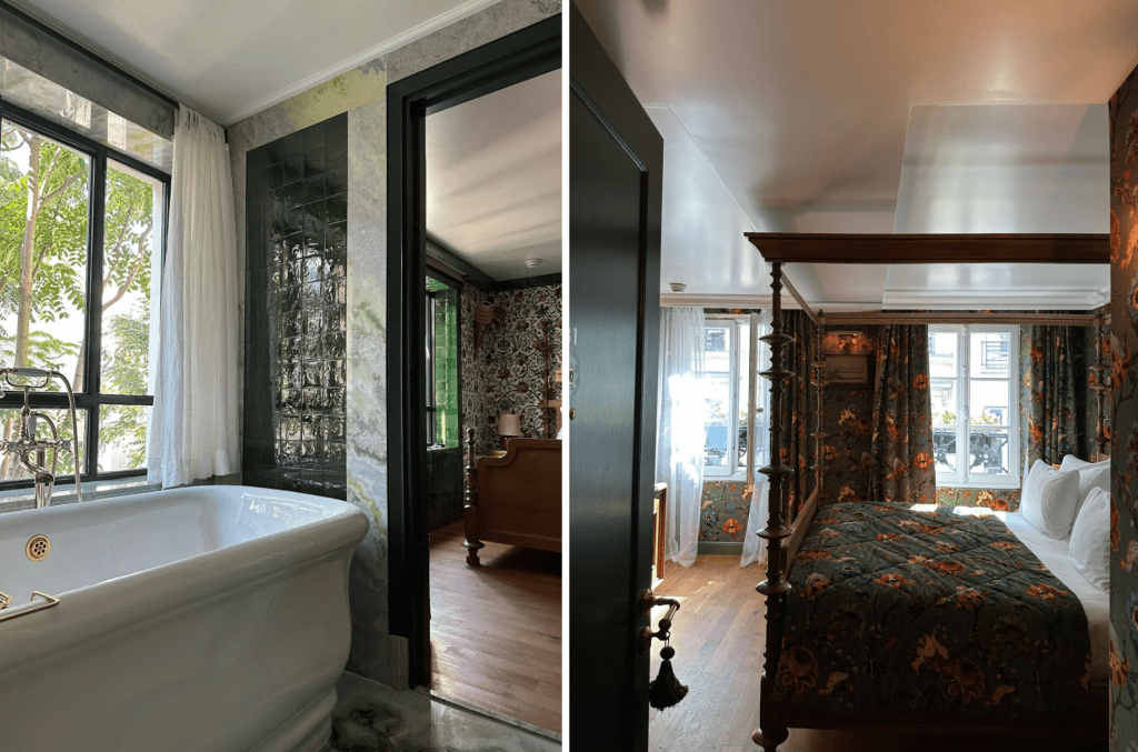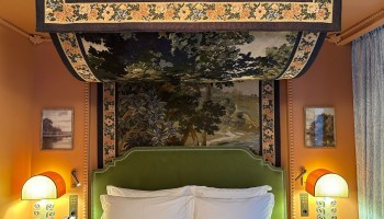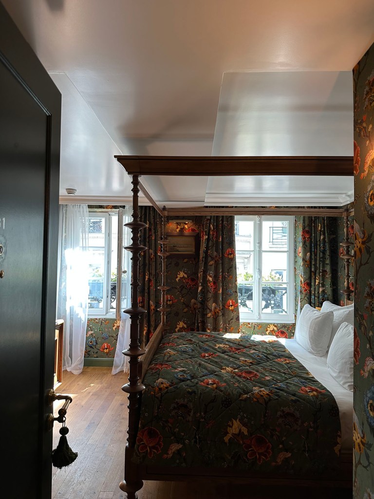 The rooms… There are 26 of them, and while none are the same, they are all well-appointed—walls and closets are upholstered in the most beautiful fabrics. There’s a very smart use of space, with no useless furniture in the room, a bathroom with a huge tub, and great light given the windows onto the garden.