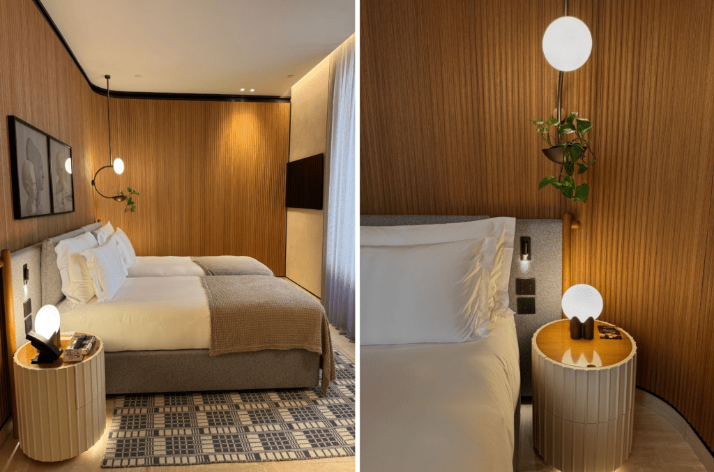 The rooms… We stayed in one of their deluxe rooms, which was sleek and spacious, with a walk-in closet and small sitting area. The design leaned earthy and textural: travertine stone floors, walls finished in cocciopesto and tambour panelling, and a sculptural orb-shaped light near the bed draped with a hanging plant.