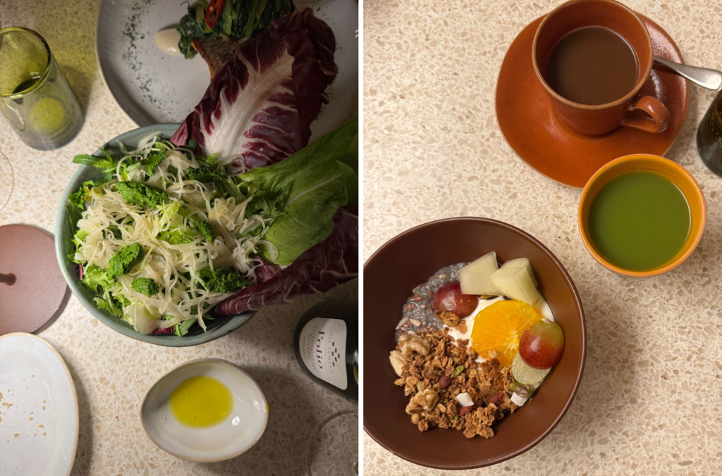 The food… was equally indulgent and nourishing. I’m not usually someone who eats at the hotel on repeat, but the breakfast was so good the first morning that we ended up going back every day. There was a generous spread of vegetables, fruits, cheeses, breads, yogurts, chia seed puddings—plus a made-to-order menu with eggs, toasts, and smoothies. The daily-changing juices and granolas (I still think about the coconut, goji berry and pistachio one) were my favorite.