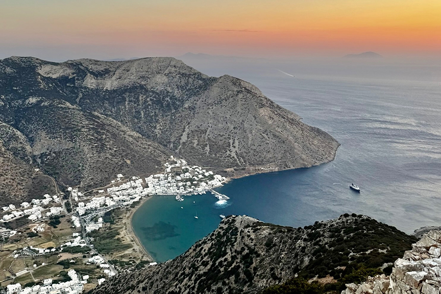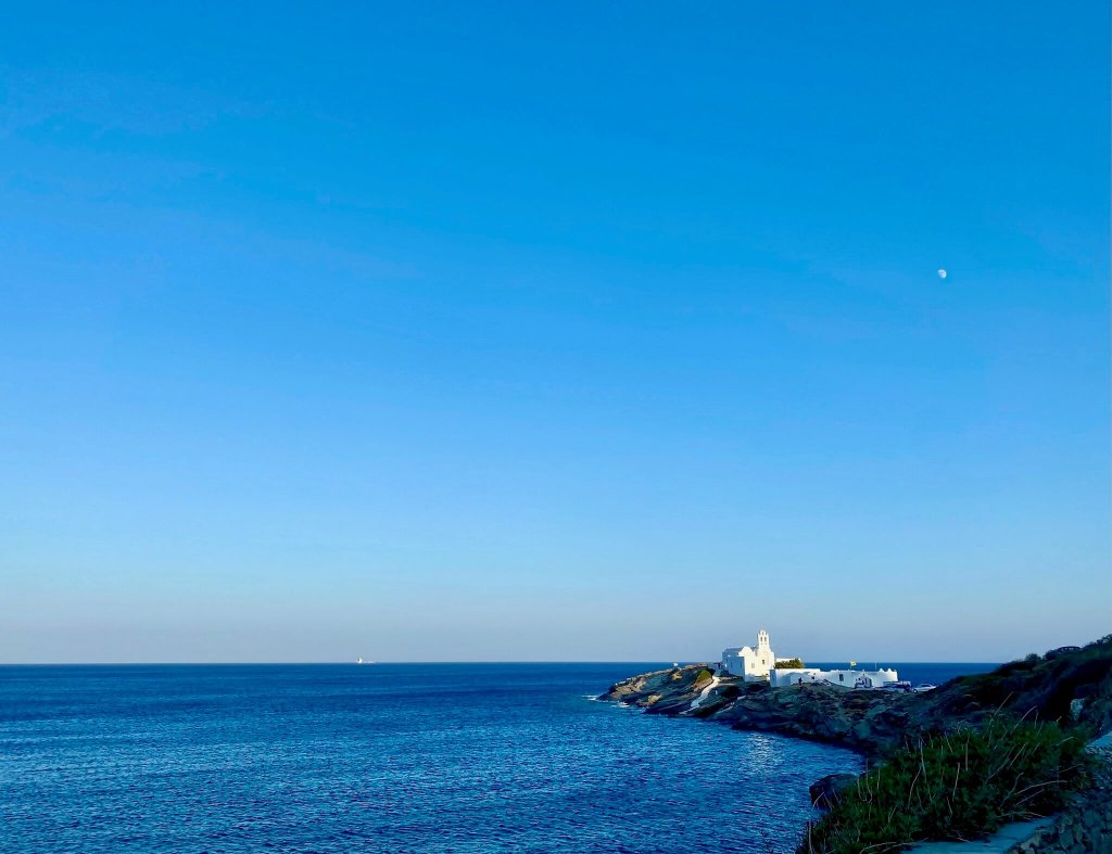 Hello from… Sifnos, Cyclades, Greece. It is no coincidence that this island’s capital, Apollonia, inherited its name from Apollo, the Ancient Greek God of light, as it’s the light here that gets me every time. As the co-founder of The Cycladist, a boutique travel design agency focused on the Greek islands, I first visited Sifnos fifteen years ago and immediately felt I’d landed in a place of intangible magic. The same thing happens every time the ferry pulls into Kamares. The minute the colors, the whitewashed houses, village hills and long stretch of sandy beach come into view, it’s as if a weight lifts from my shoulders and a sense of freedom and calm happiness that is quintessentially Cycladic descends.