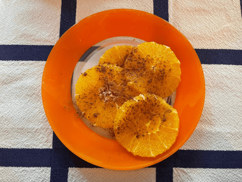 Peel oranges, remove pith, and cut into 1/4” slices. Add orange blossom water to the oranges, arrange on a plate, cover, and refrigerate for an hour or so. Before serving, sprinkle cinnamon on top and, depending on the sweetness of the oranges, you could opt to sprinkle a little granulated sugar, or drizzle a little honey.