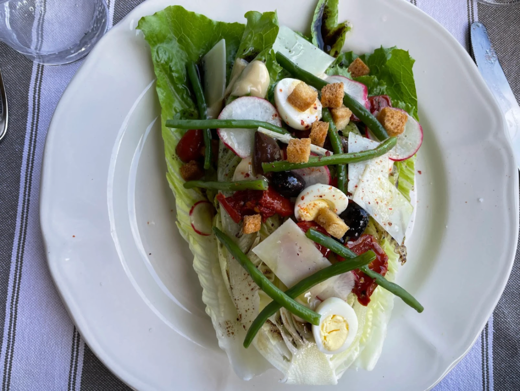 Les Sources des Caudalie is a lovely hotel/spa/winery/restaurant near the Bordeaux airport and not far from our house in the Médoc, so we will occasionally spend the night there if we have an early morning flight. Recently we went for lunch before picking up a friend, and they served this incredible salad. You could definitely swap in whatever ingredients you have on hand—the thing that was so great about it was the way they dressed the lettuce. They must have stood it up and drizzled it in because it was on every leaf—which is impossible with romaine/gems—normally I end up continuously dressing it as I go.
