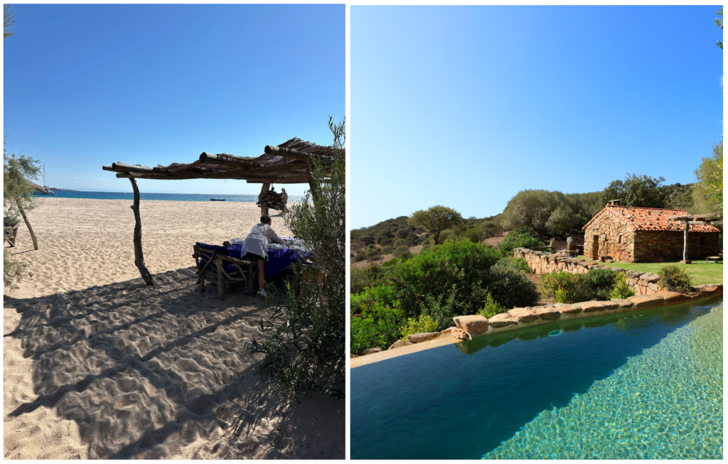 The rooms… Our room in the Hotel de la Ferme had a lot of details that nodded to its farmhouse origins—big beamed ceilings, stone walls, and wooden floors…with Sardegnan soft wool carpets and lovely antiques throughout. We toured some of the rental properties, and they are so charming that we immediately asked about them for ourselves for next year. A Mandria is a bit further from the beach and the restaurants, but it is a less expensive option than the Ferme. It feels a bit more modern, and has individual pools in some of the rooms.