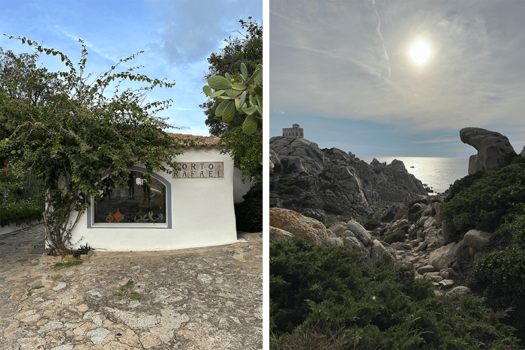 Roberto brought us to J Beach, a very cool seaside restaurant and beach club with loungers, where we had one of the best meals of the trip—another local vermentino, local lobster with homemade pasta, followed by another post-lunch seaside nap. (Consistency is important!) From there, we ventured north—Roberto and Anna were determined that we should see as much of the north of the island as possible. We stopped at Capo Testa, the northernmost point, from which you can see Corsica and the chalky cliffs of Bonifacio, and hiked around its fantastic rock formations. Then we drove to have cocktail hour in the town of Porto Rafael, a place with an incredible origin story (look it up!) that makes many locals act like they’re looking at a puppy when they’re talking about it. Matt said it reminded him of Montecito, and he didn’t like the real estate agent offices that took over most of the town square, but I fell for its charm.